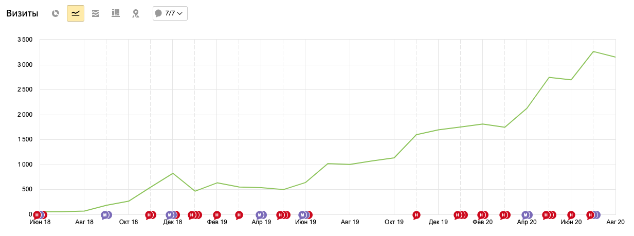 Развитие этого проекта было постепенным, без закупок ссылок и каких-либо значительных манипуляций. Постоянно собирали все возможные запросы по Москве и обл. и под них создавали посадочные страницы, писали тексты и создавали хороший контент для карточек товаров. В итоге мы получили постоянный рост в посещаемости и продажах.